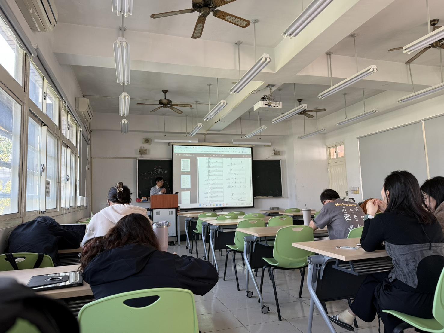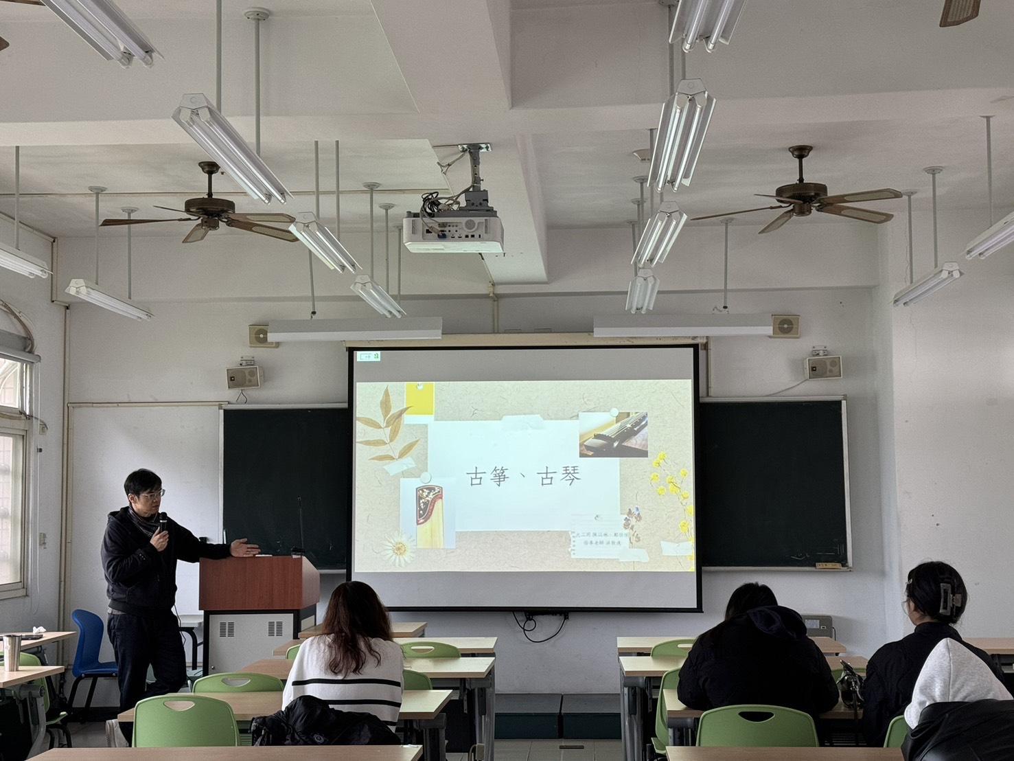 圖一說明:於《樂器學》課堂中講解「古箏與古琴」之構造與音響特色,並引導學生理解其在傳統音樂中的角色與文化意涵。