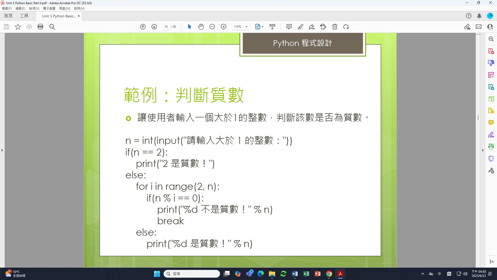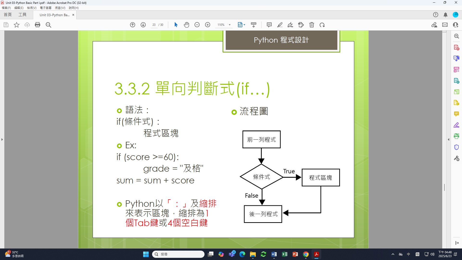 在「Python程式語言」單元,同學認識Python語言的變數、數值型態、布林型態、字串型態、算術運算子、關係運算子、邏輯運算子、基本輸出入指令及參數、程式流程控制指令、迴圈、資料結構及函式等。