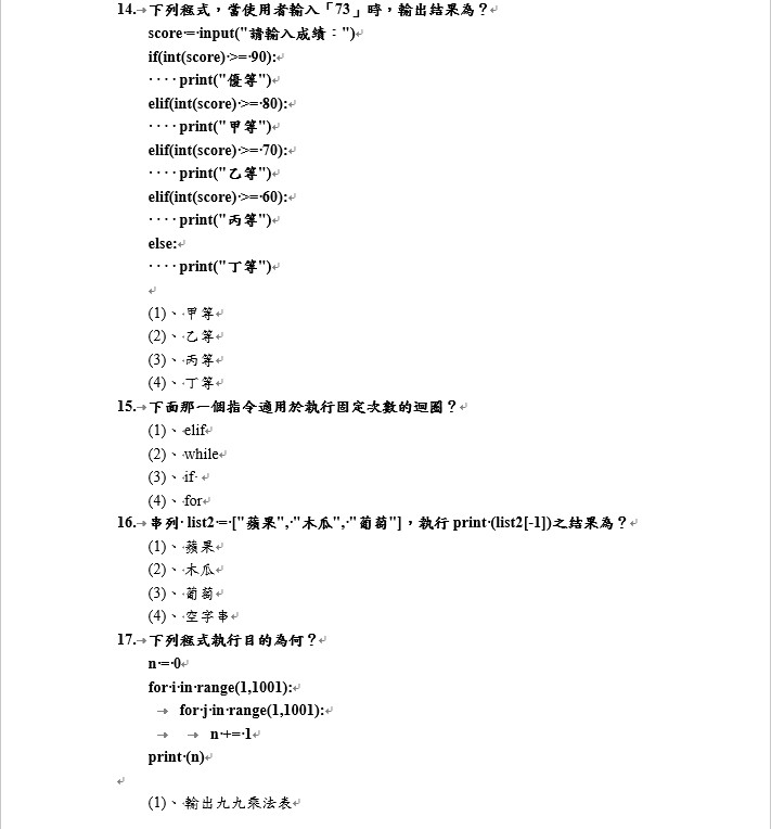 以「Python程式語言」為測試範圍,設定4選1之單選形式20道問題於課後測驗,以瞭解學生修課後程式設計素養之能力。