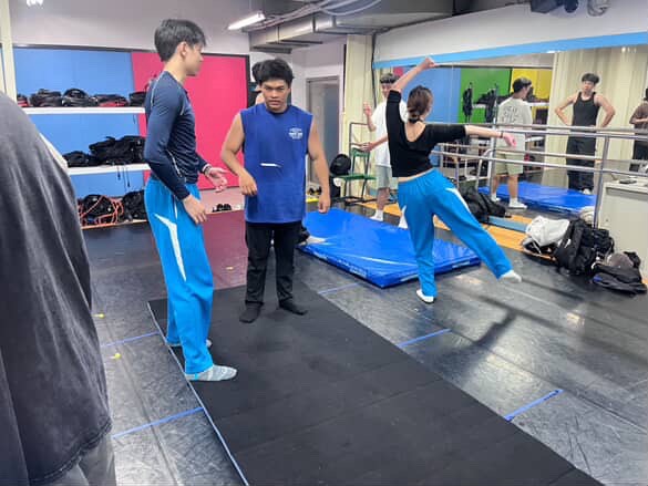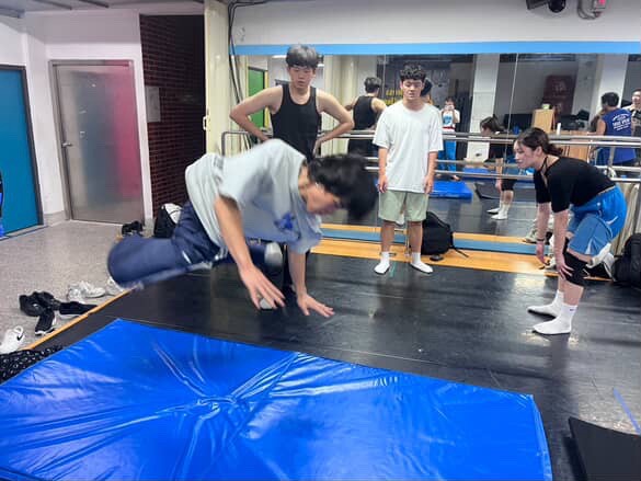在上課期間練習翻滾動作,並且教導學生開發表演細膩度的方法。