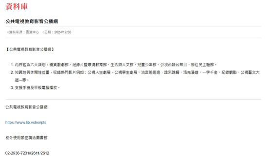 公共教育電視影音公播網內容富含知識性與休閒性,熱門影片含公視人生劇展、公視學生劇展等寓教於樂優質節目,適合讀者品劇觀賞,有利雲端教學與課外學習資源的有效利用;期藉由觀賞好劇,從發人深省的劇情中,厚植本校師生人文素養與對社會的關懷貢獻。