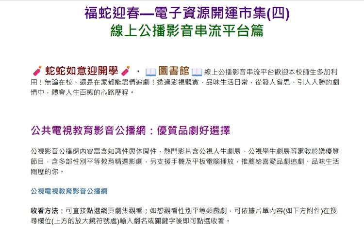 圖三說明:福蛇迎春—電子資源開運市集(四)線上公播影音串流平台篇,推廣公共教育電視影音公播網,乃優質品劇的好選擇。