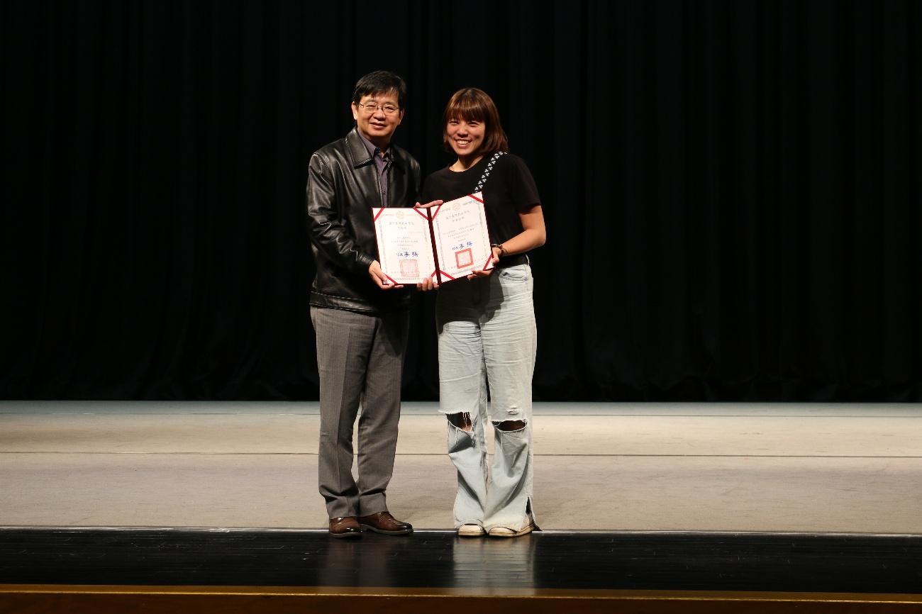 圖二說明:校長頒發感謝狀予帶隊教師周孝柔。