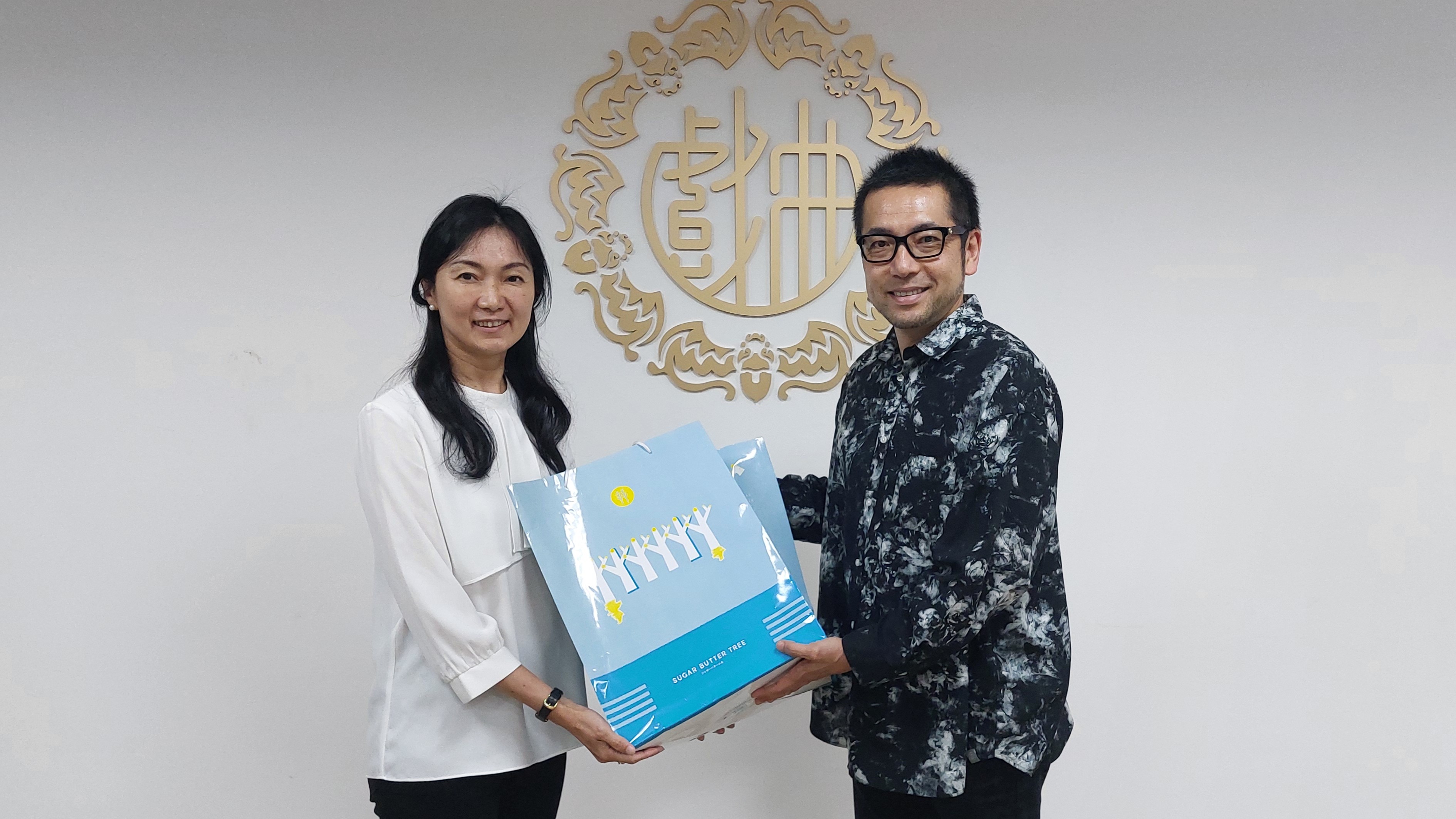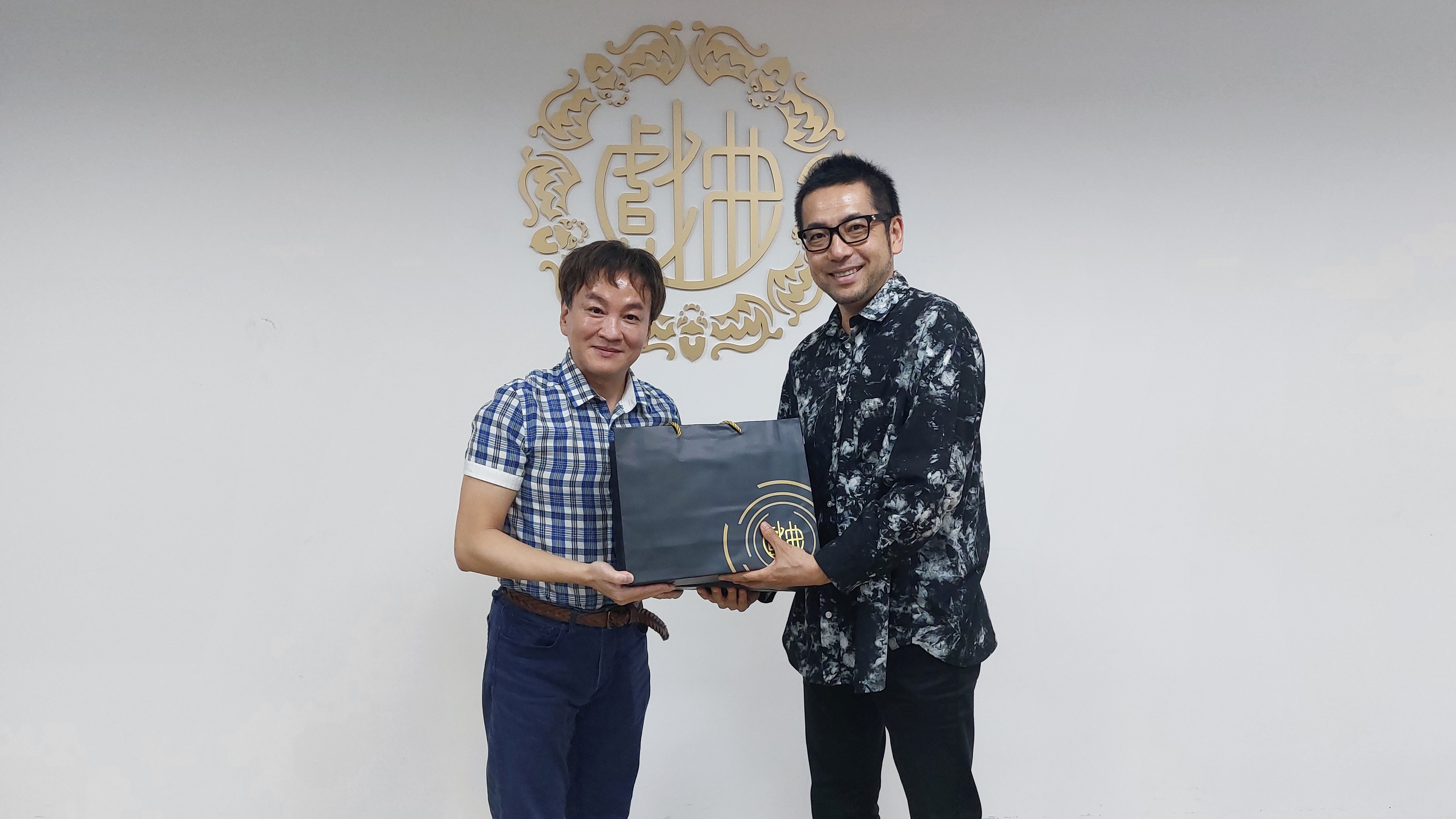 圖二說明:本校民俗技藝系主任吳品儀與シライ藝術總監白井先生交換禮物。