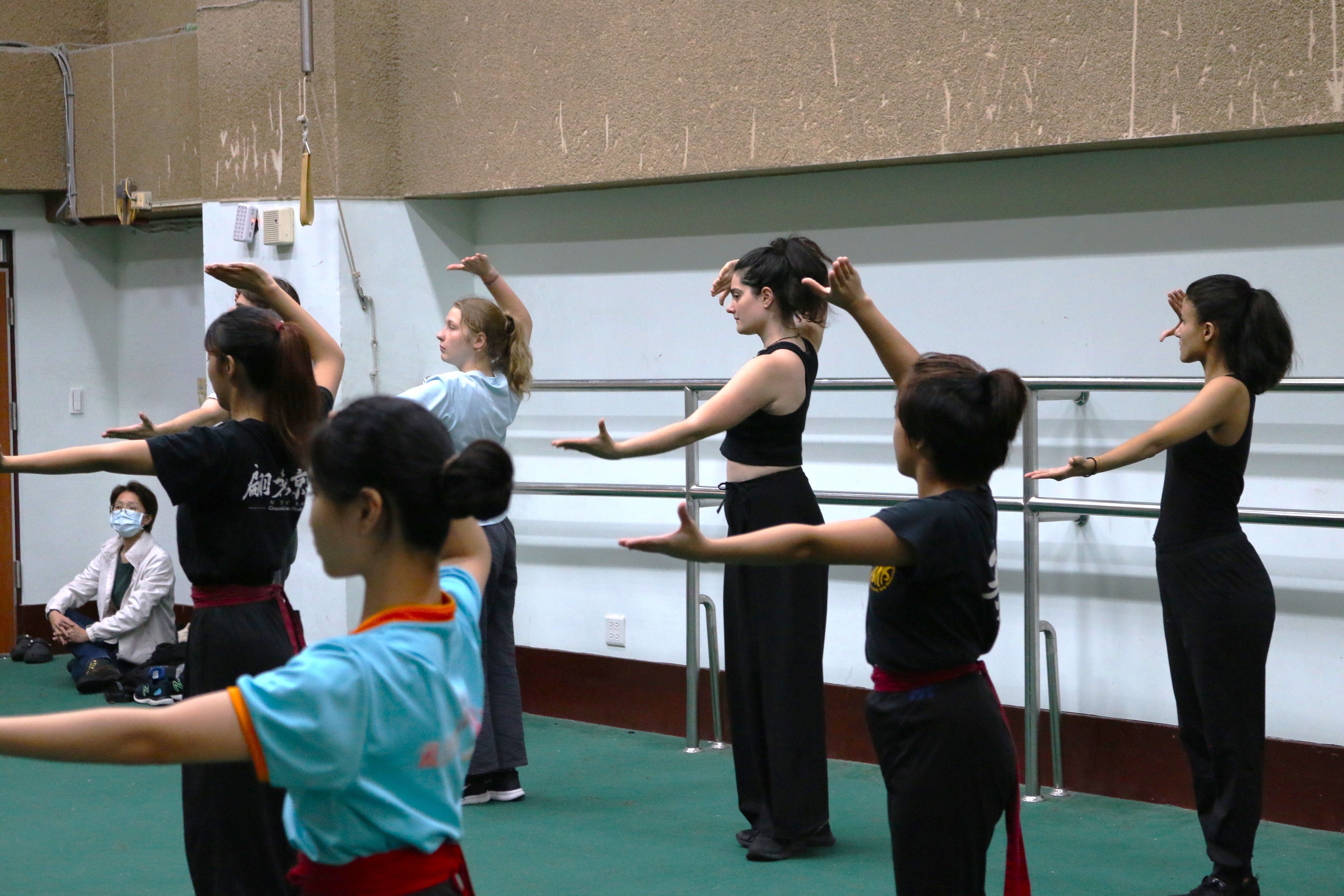 圖八說明:法國學生與京劇系學生一同劈腿、仰頭暖身。