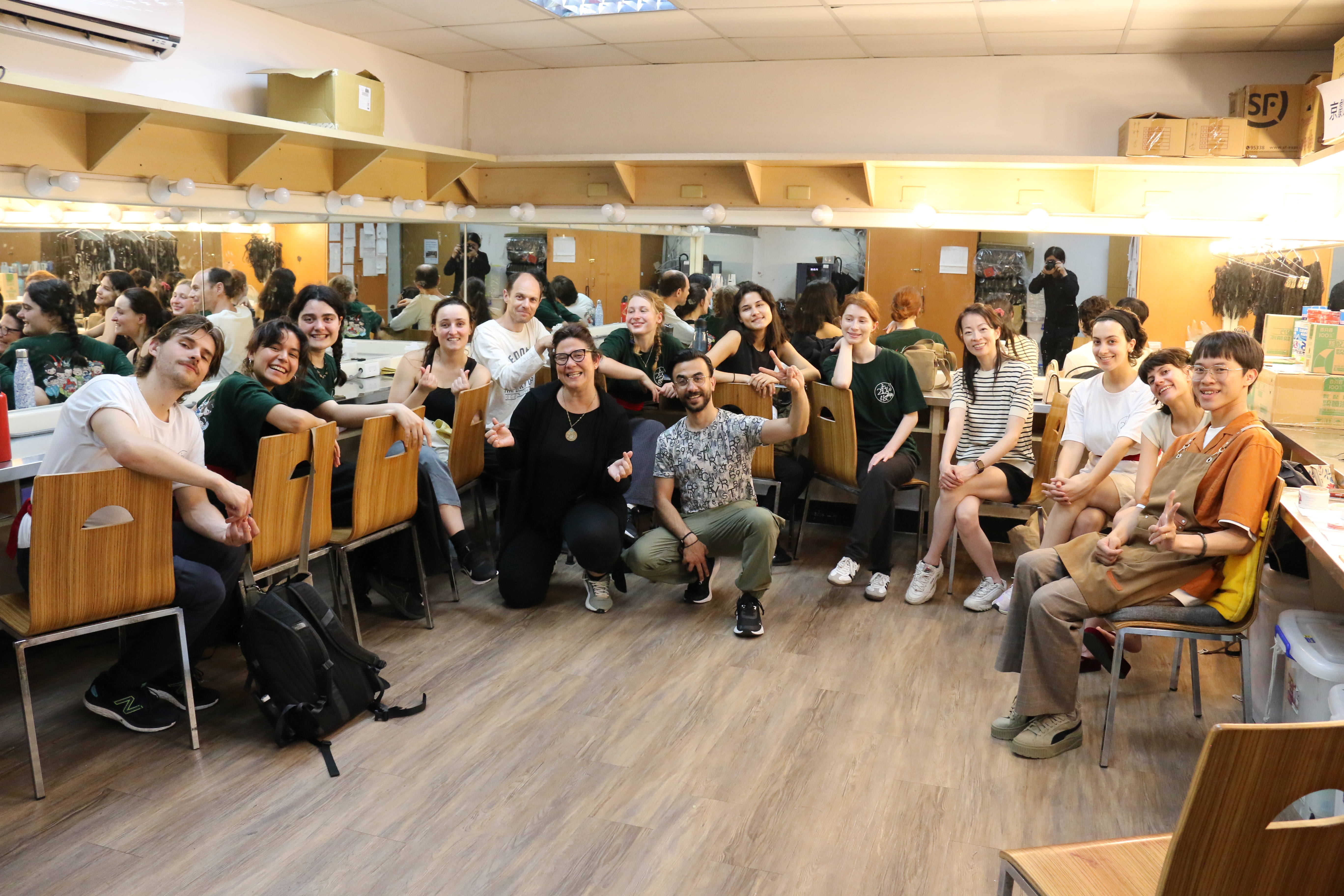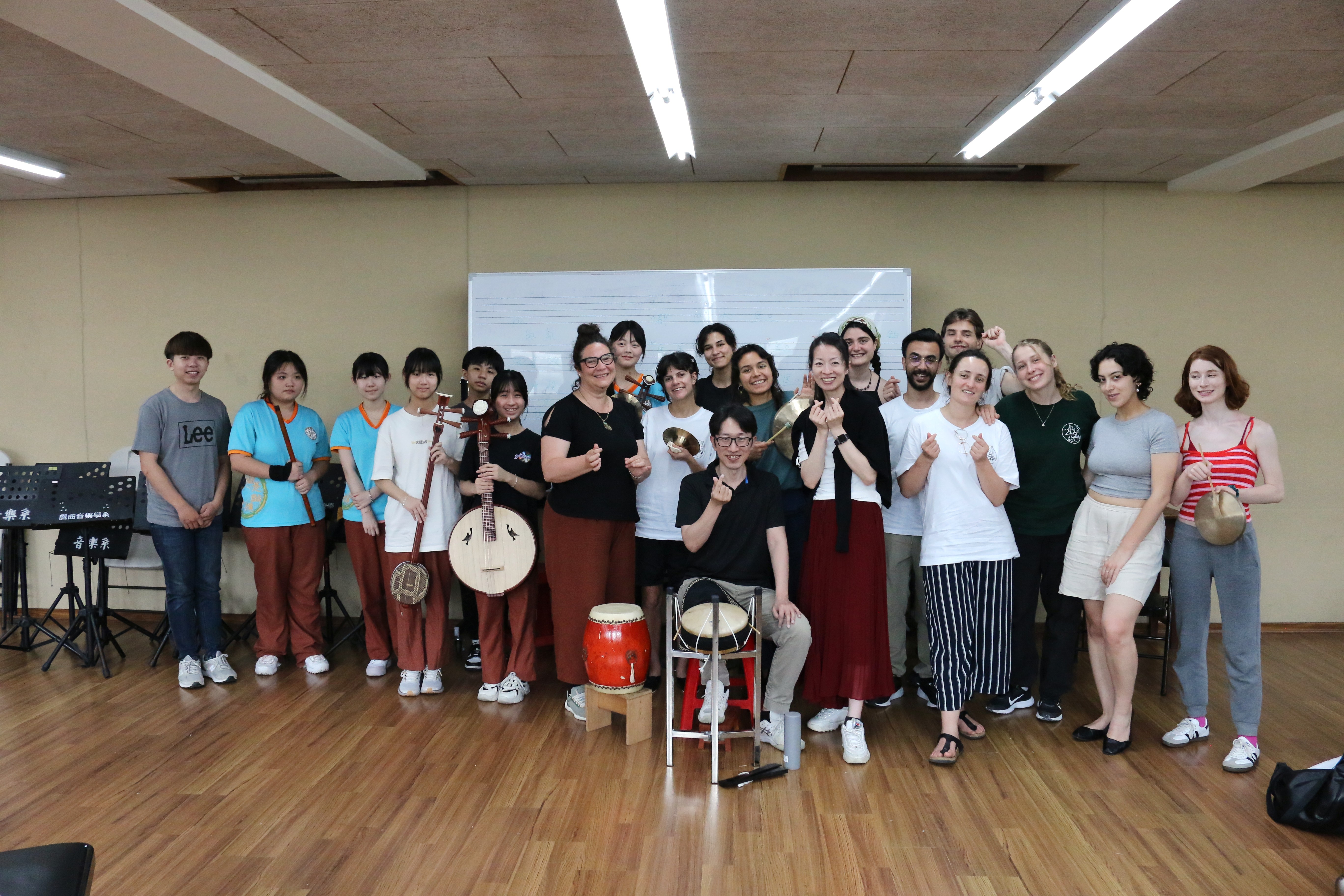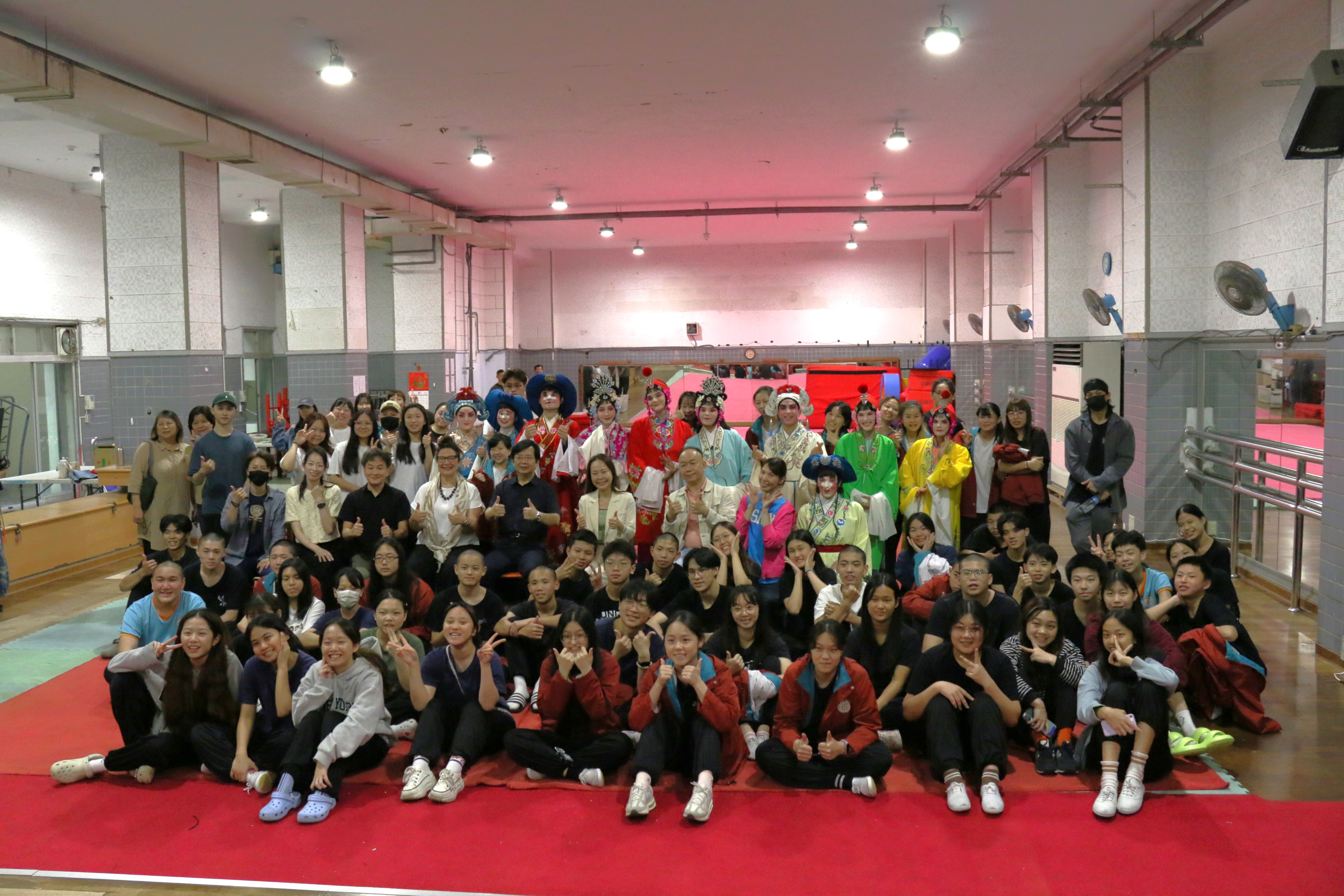 圖六十四說明:在課堂上的歌仔戲及京劇系同學,歡欣鼓舞地來觀賞法國朋友演出。
