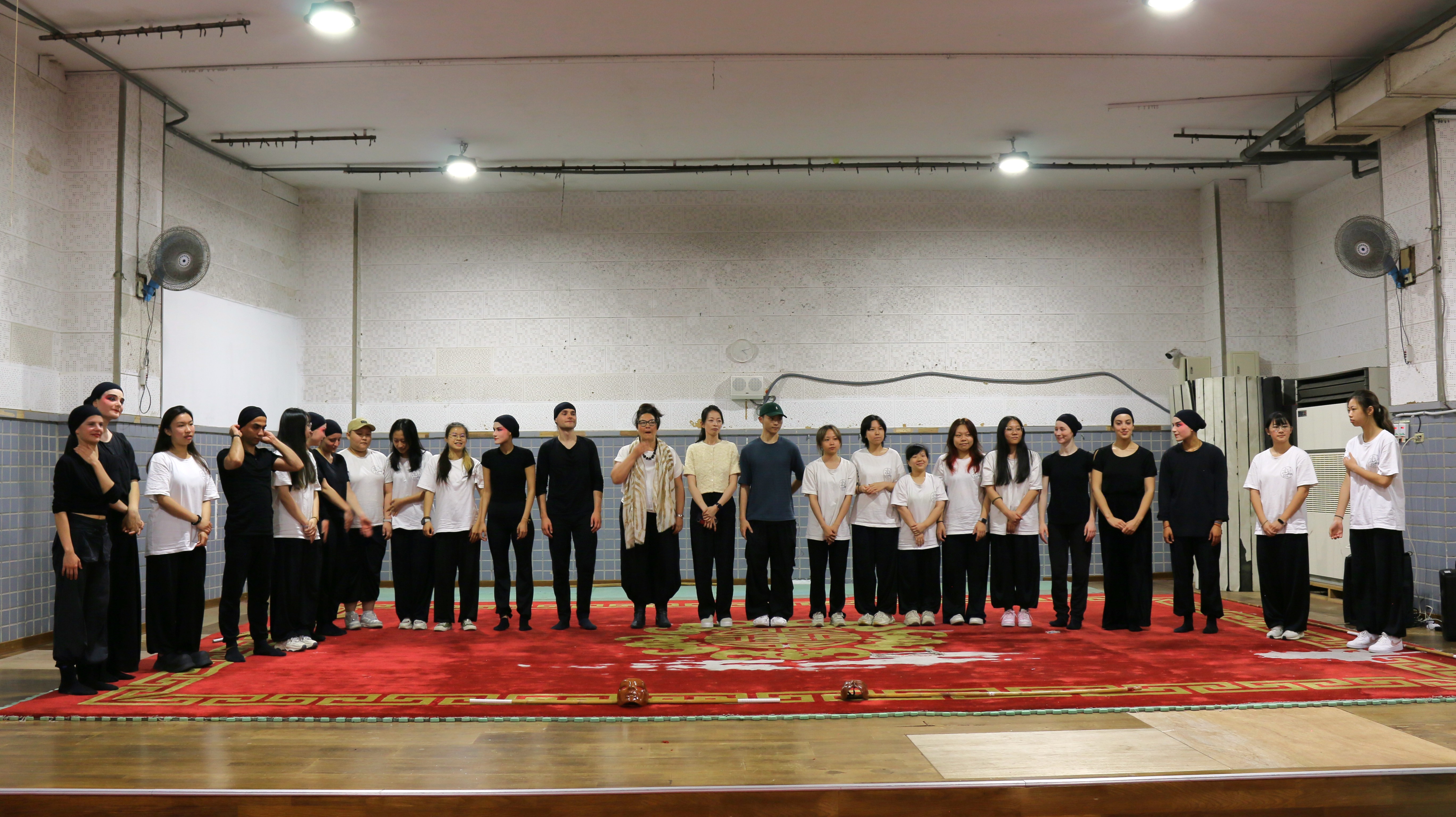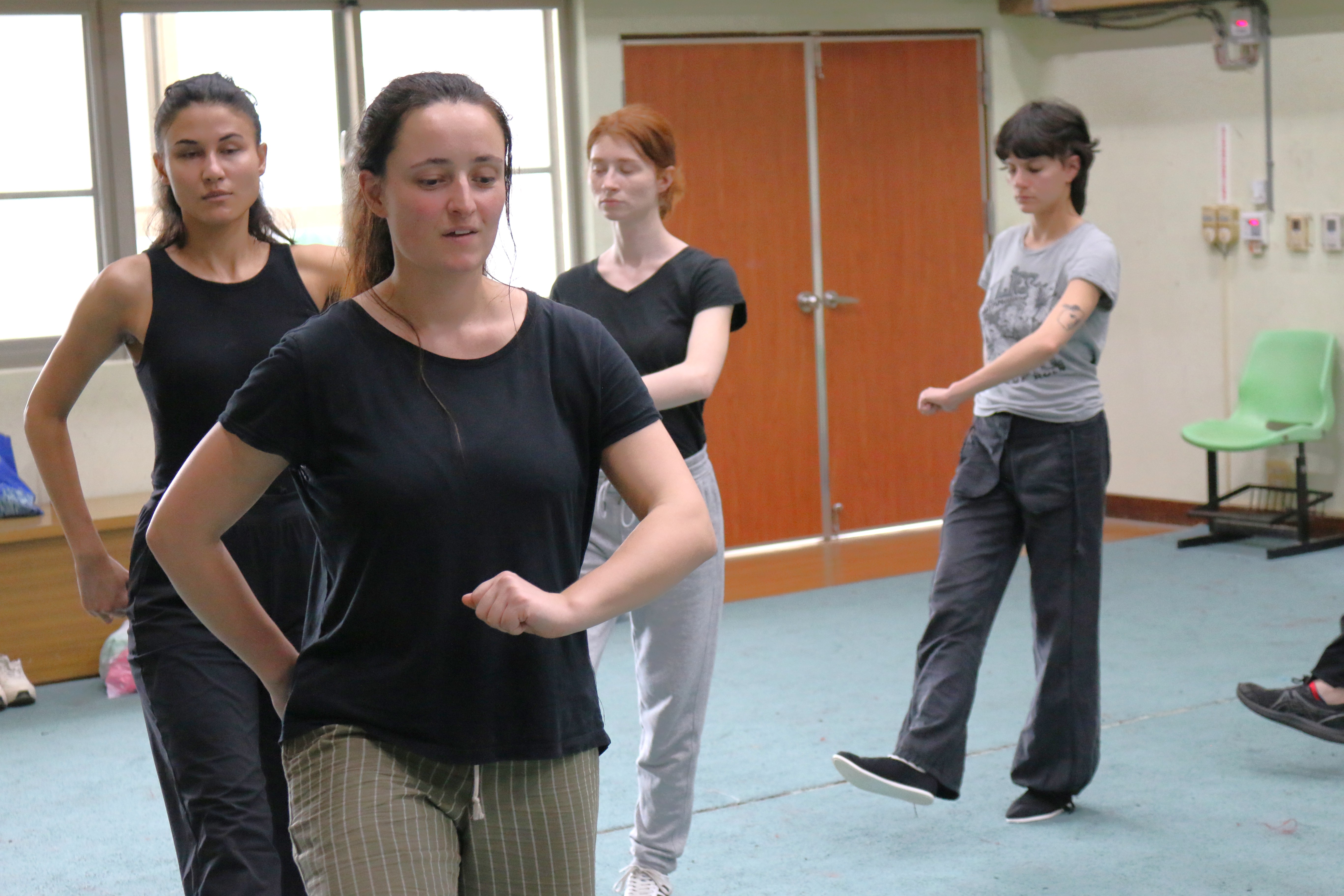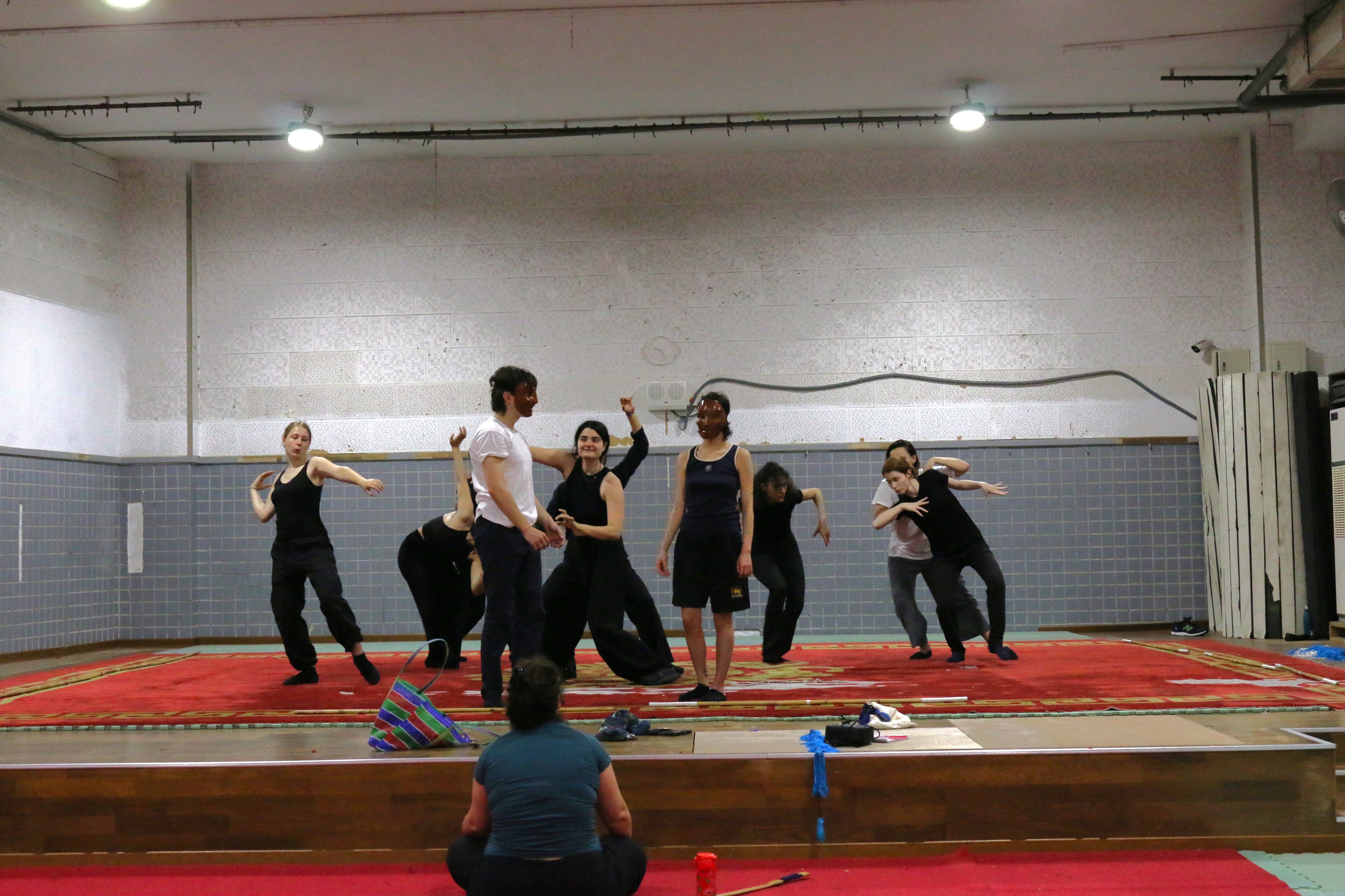 圖五十說明:6月5日成果展法國學生也帶來他們的面具表演,圖為前一天晚上彩排照片,前方台口墨藍色衣服為正在導戲的Giulia Filacanapa。