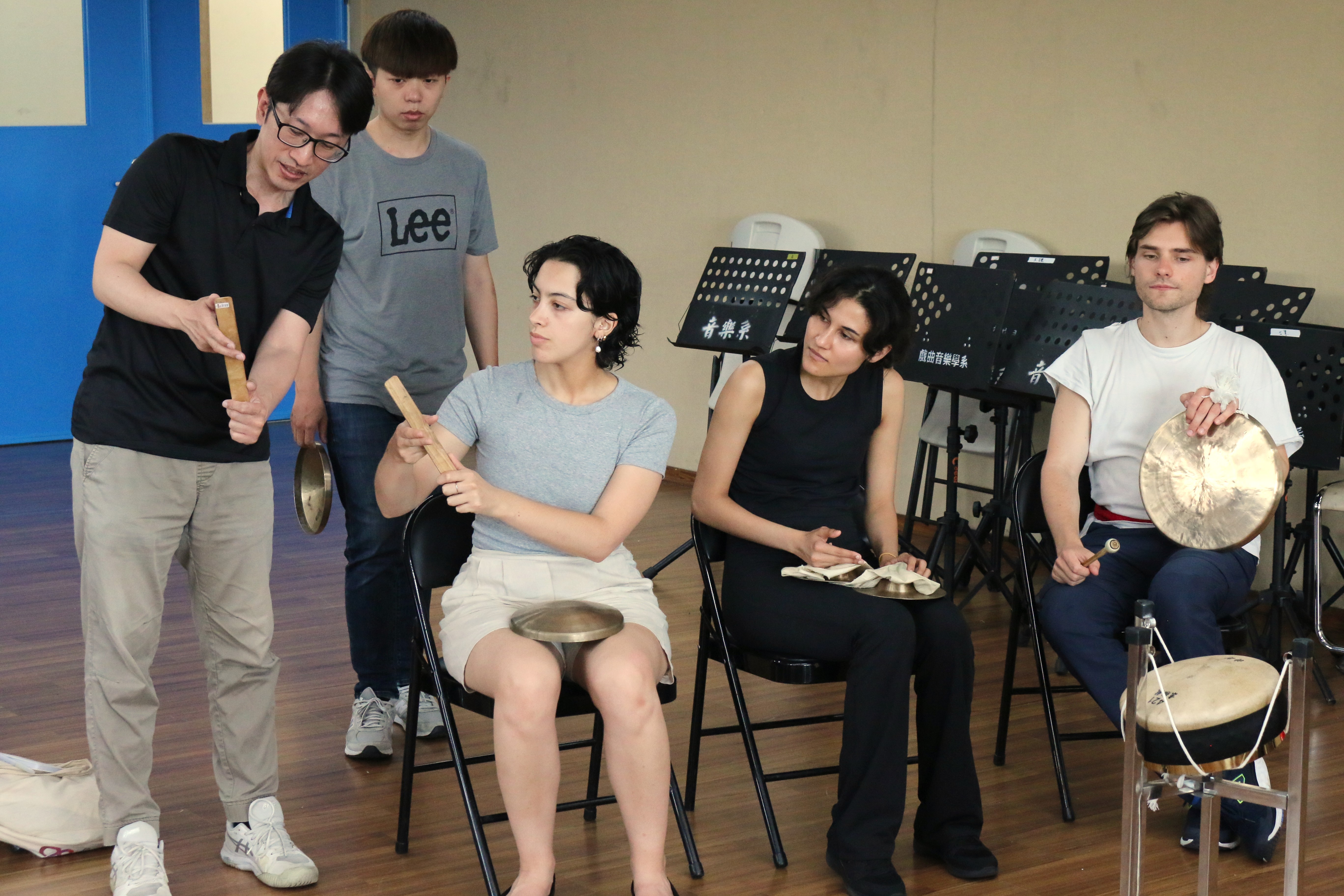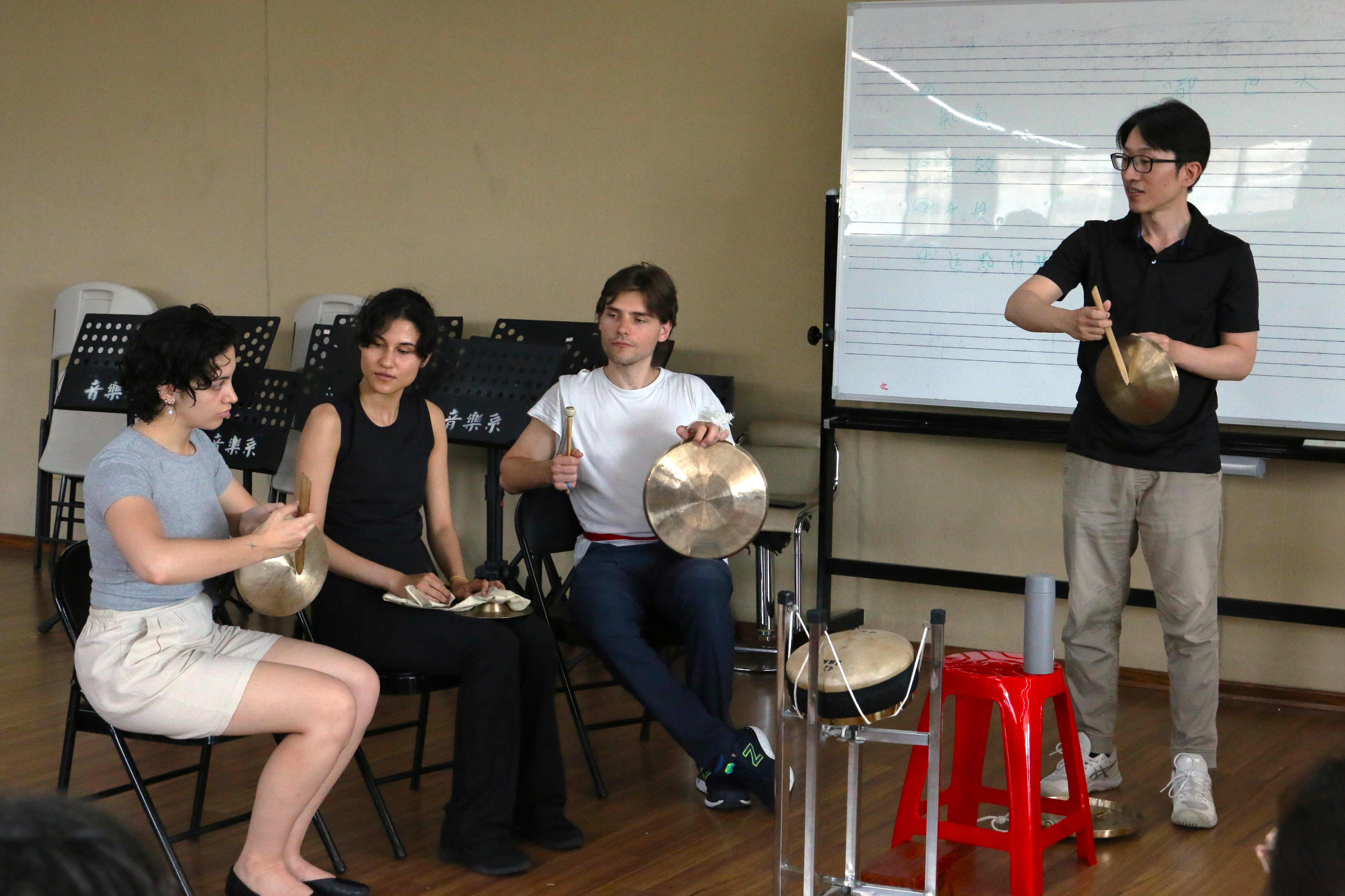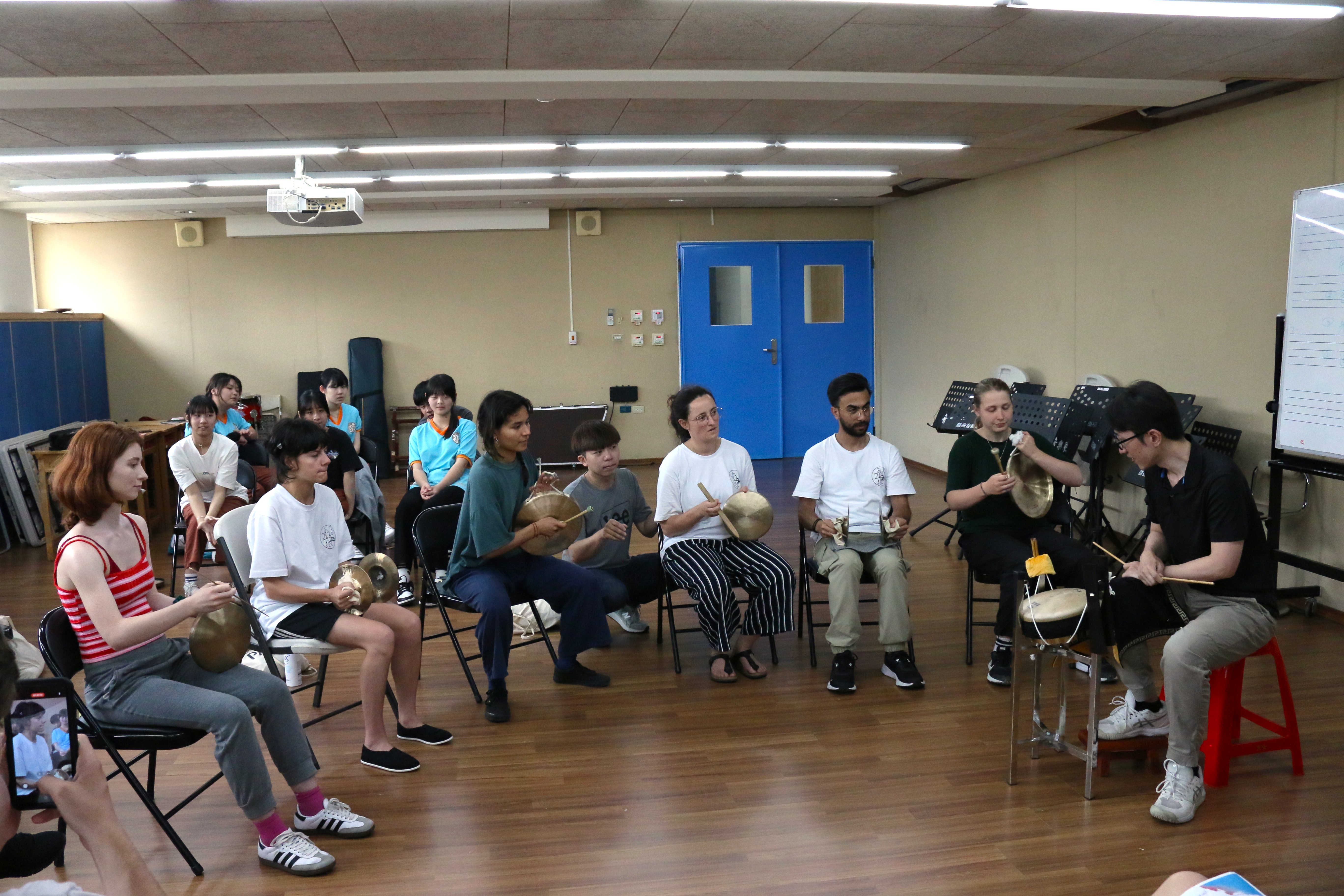 圖三十二說明:法國學生嘗試擊打樂器。