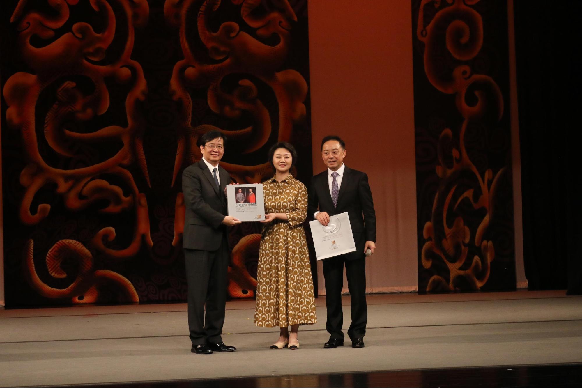 圖二說明:本校校長與中國戲曲學院老師于魁智與李勝素交換禮物。