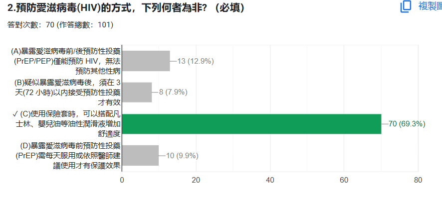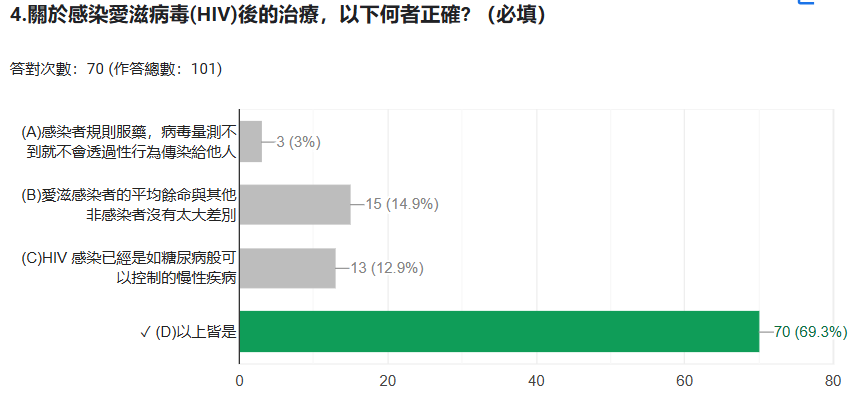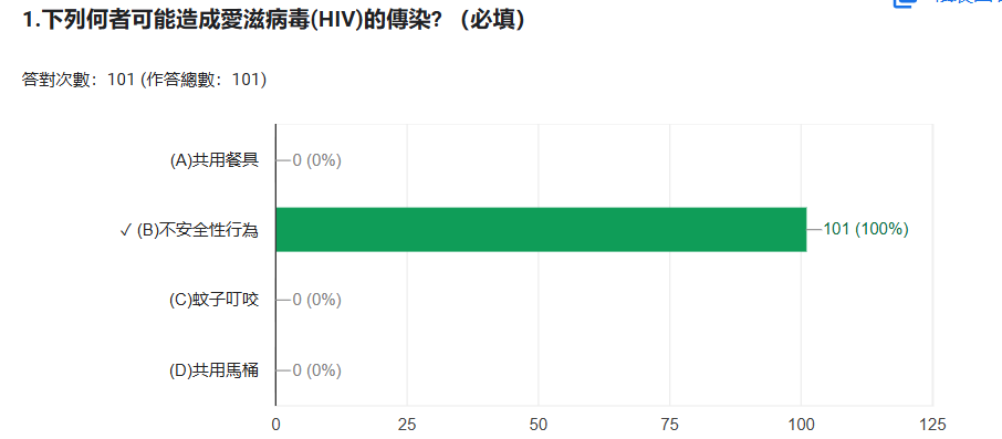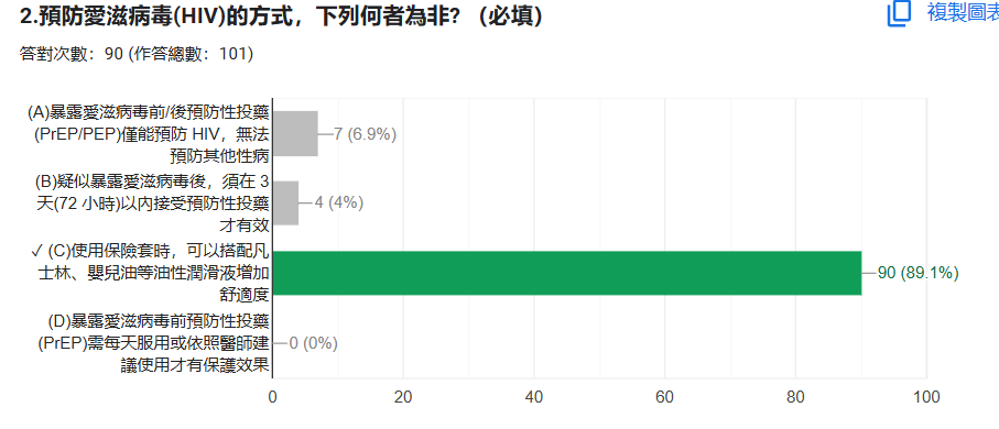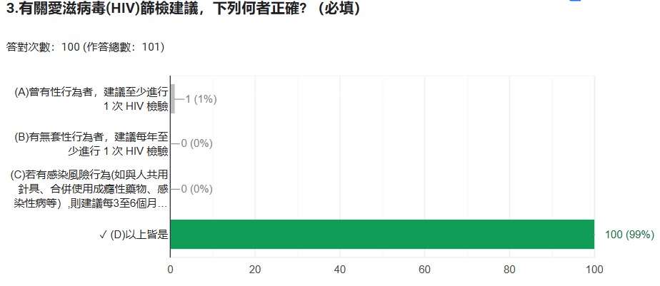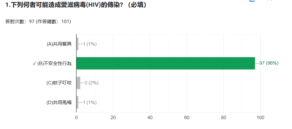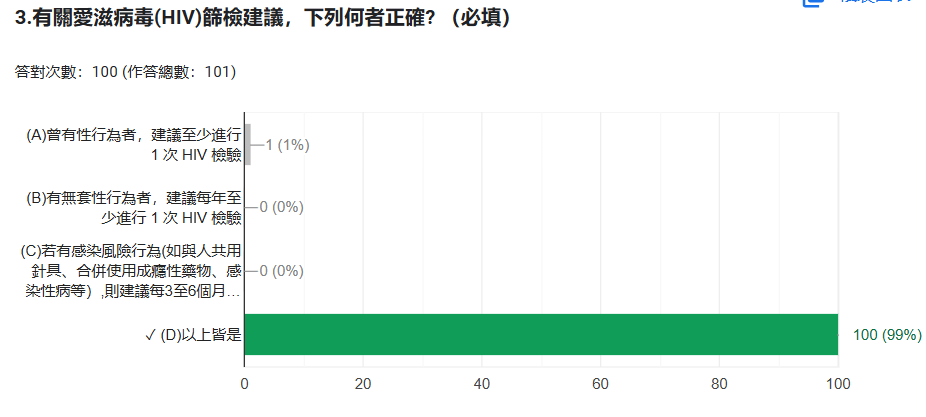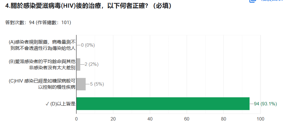 - 在愛滋防治知識題目中,多數題目答對率於後測均有明顯改善,顯示學員對相關知識的理解度提升。
