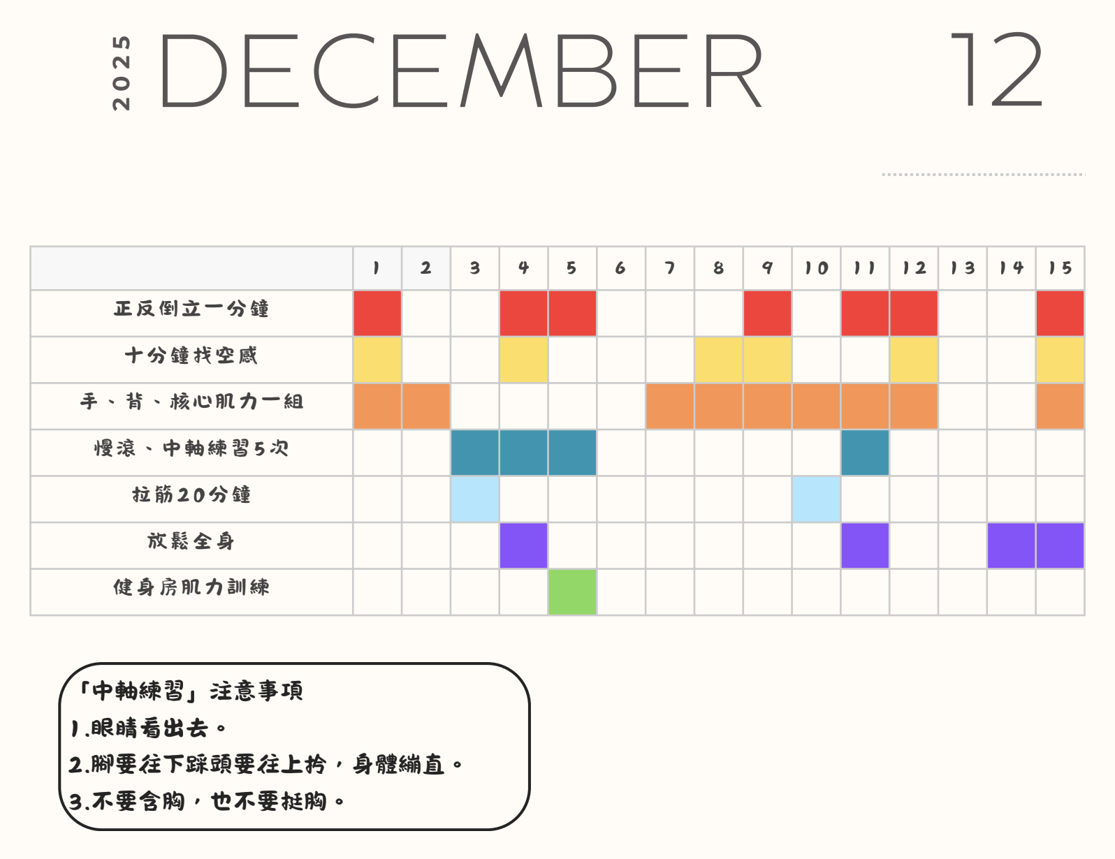 繳交一份制定練習菜單與30天的追蹤記錄。先是找出參照的標的,按照目標制定訓練內容,並記錄過程,讓想法與累積具象,脫離創作與練習動力的內耗。