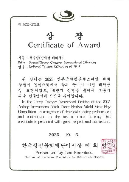 114年9月25日至10月6日率領學生參加安東假面舞蹈節,共完成6場小場演出及3天正式舞台演出(共9場),於國際競賽中榮獲團體組第六名及「最佳表演獎」(檢附證明)。高密度演出強化學生臨場應變與舞台穩定度,團隊回饋顯示逾八成學生認為此行明顯提升專業自信與國際舞台適應能力;小場互動演出亦促進跨文化交流,有效提升本校國際能見度與藝術專業形象。