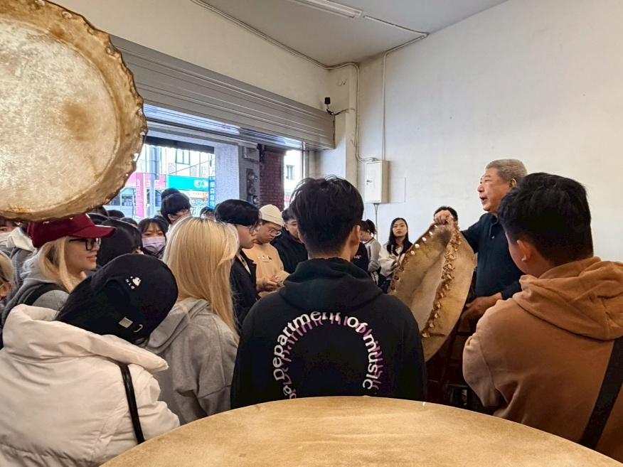 帶領學生深入新莊在地百年老店「响仁和鐘鼓廠」,親炙國家級文化資產之工藝風采。透過實地參訪、大師工作坊,師生將近距離觀摩「人間國寶」王錫坤老師及其團隊的製鼓歷程,從選皮、繃鼓到調音,深入理解傳統樂器背後的聲學原理與材質特性。