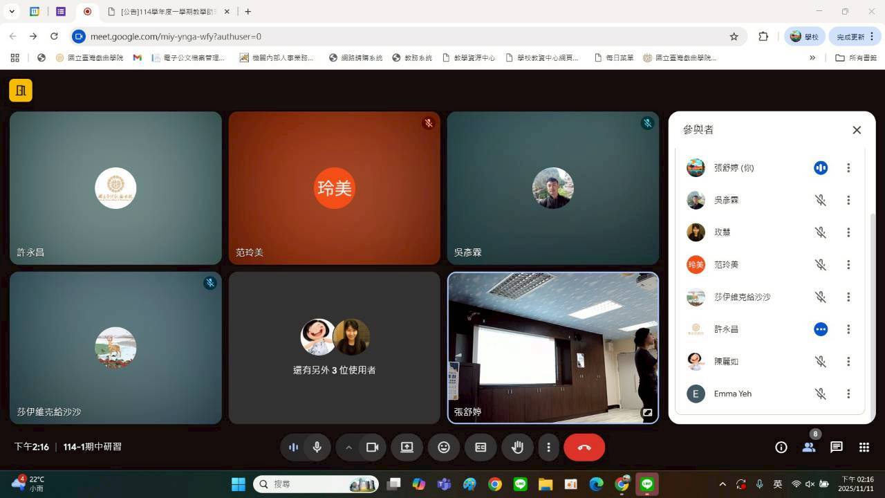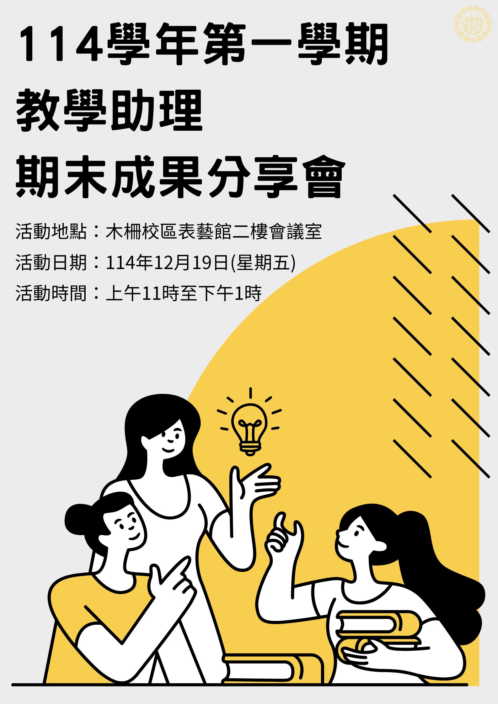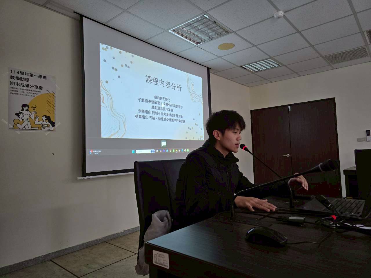 於114年12月19日辦理,由本學期20位教學助理輪流報告輔助課程教學心得,並展示課程紀錄影片,分享本學期工作執行內容與遇到的問題,相互交流。