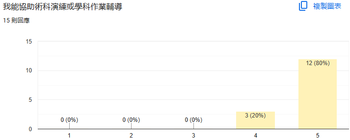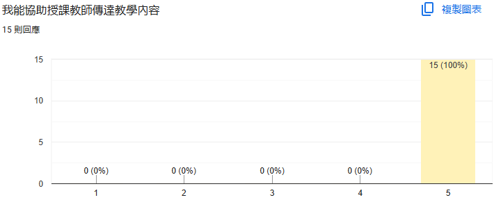 - 自評能協助授課教師傳達教學內容:100%認為自己非常符合。