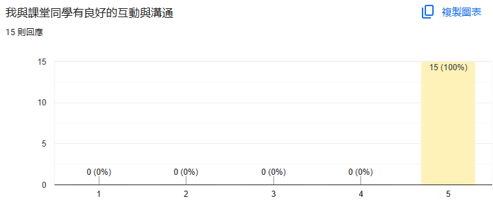 - 自評與課堂同學有無良好的互動與溝通部分:100%認為自己非常符合。
