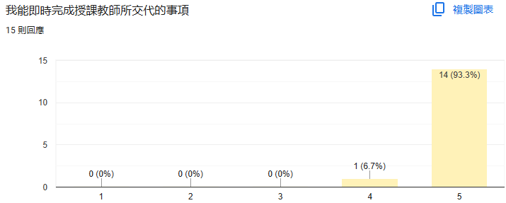 - 自評能否即時完成授課教師所交代的事項:93.3%認為自己非常符合,6.7%認為自己符合。