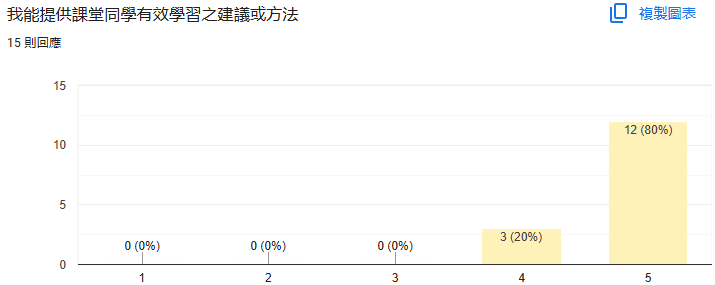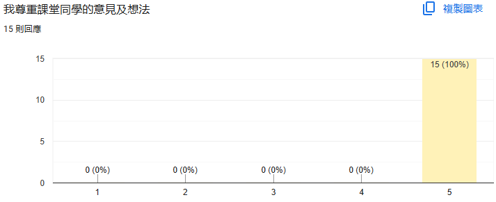 - 自評尊重課堂同學的意見及想法:100%認為自己非常符合。
