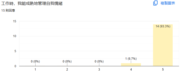 - 自評工作時,能否成熟地管理自我情緒:93.3%認為自己非常符合,6.7%認為自己符合。