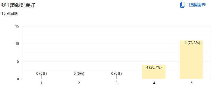 - 自評出勤狀況良好:72.3%認為自己非常符合,26.7%認為自己符合。