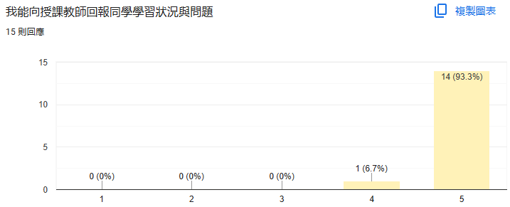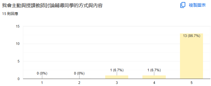 - 自評是否會主動與授課教師討論輔導同學的方式與內容:86.7%認為自己非常符合,6.7%認為自己符合,6.7%認為自己無符合亦無不符合。
