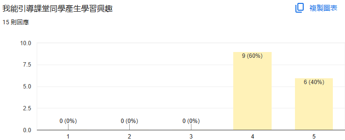 - 自評能否引導課堂同學產生學習興趣部分:40%認為自己非常符合,60%認為自己符合。