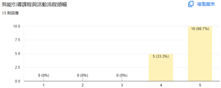 - 自評能否引導課程與活動流程順暢部分:66.7%認為自己非常符合,33.3%認為自己符合。