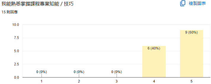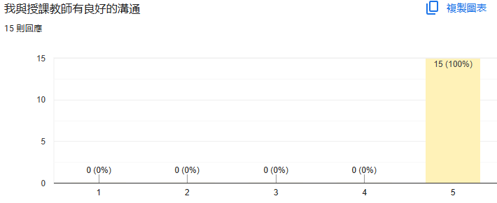 - 自評與授課教師有良好的溝通:100%認為自己非常符合。
