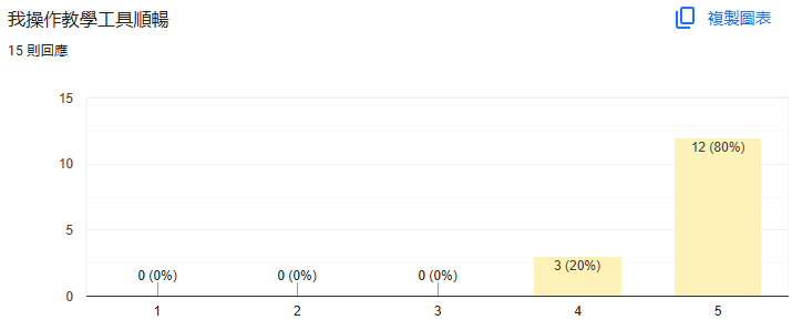 - 自評操作教學工具是否順暢部分:80%認為自己非常符合,20%認為自己符合。