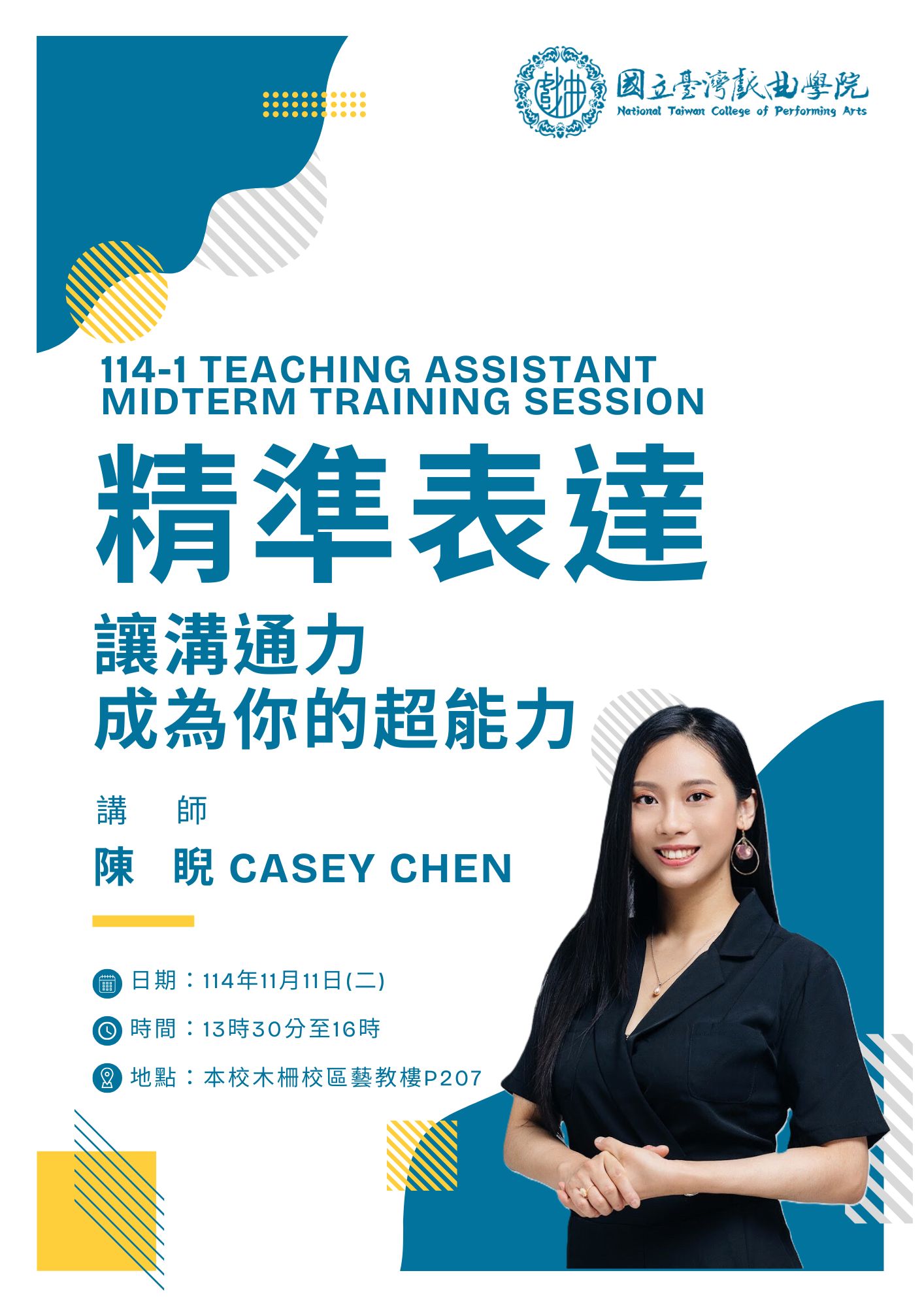 於114年11月11日辦理,本學期邀請企業講師暨口語表達顧問─陳睨講師進行授課,講授主題為「精準表達-讓溝通力成為你的超能力」,期望參與研習者透過本次課程提升參與學員溝通能力,並將相關知能帶入教學助理業務,增強與授課教師及修課同學互動效率。