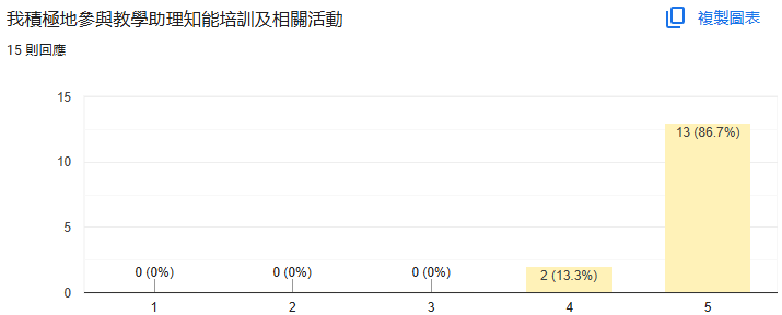 - 自評是否有積極地參與教學助理知能培訓及相關活動:86.7%認為自己非常符合,13.3%認為自己符合。