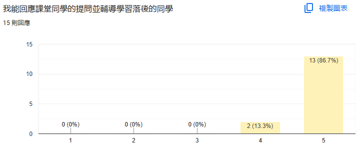 - 自評能否回應課堂同學的提問並輔導學習落後的同學部分:86.7%認為自己非常符合,13.3%認為自己符合。