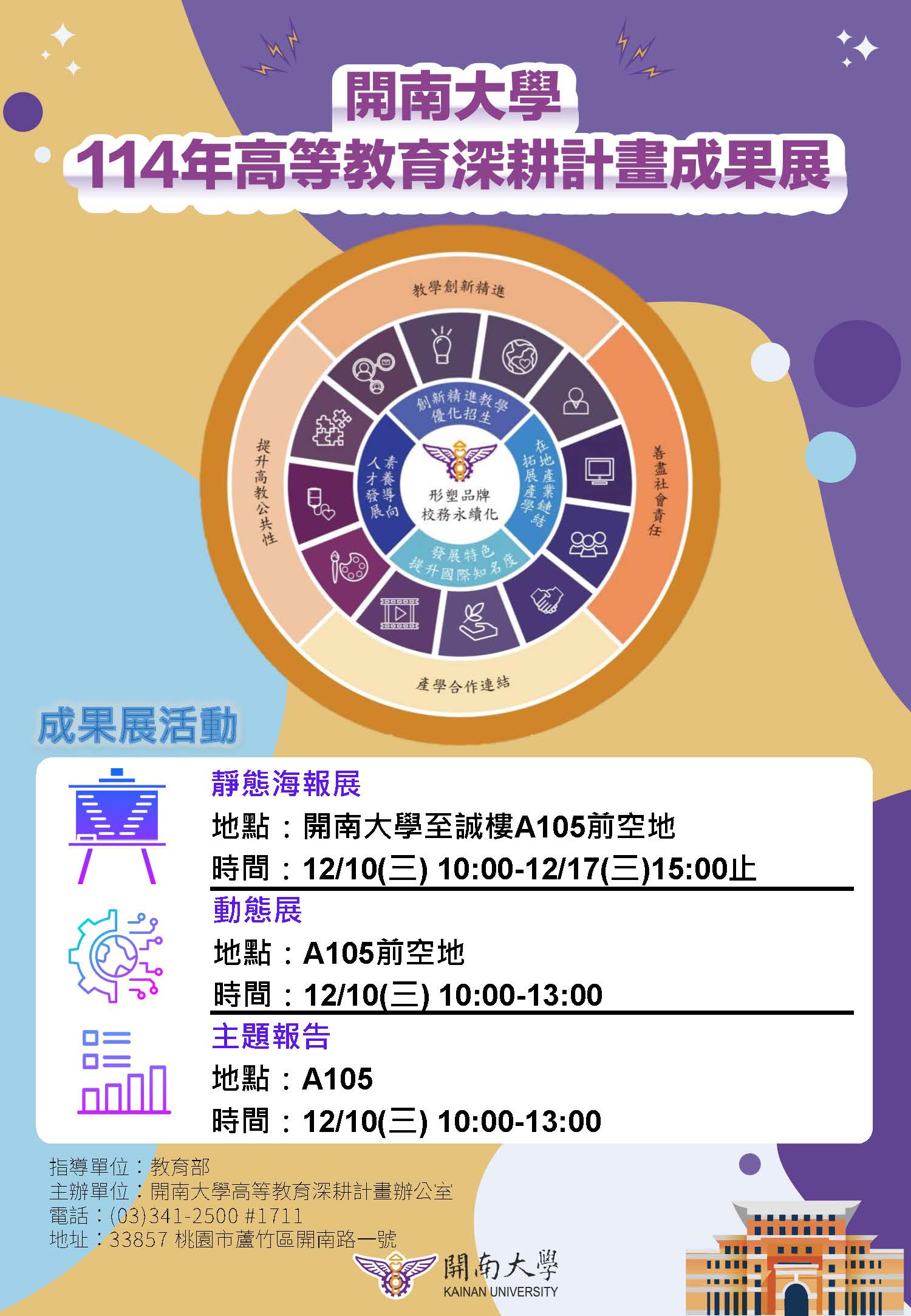 臺北教育大學為呈現該校高教深耕計畫提升教與學之成效,舉辦「114年度高教深耕計畫成果展」活動,邀請本校師生參加。
